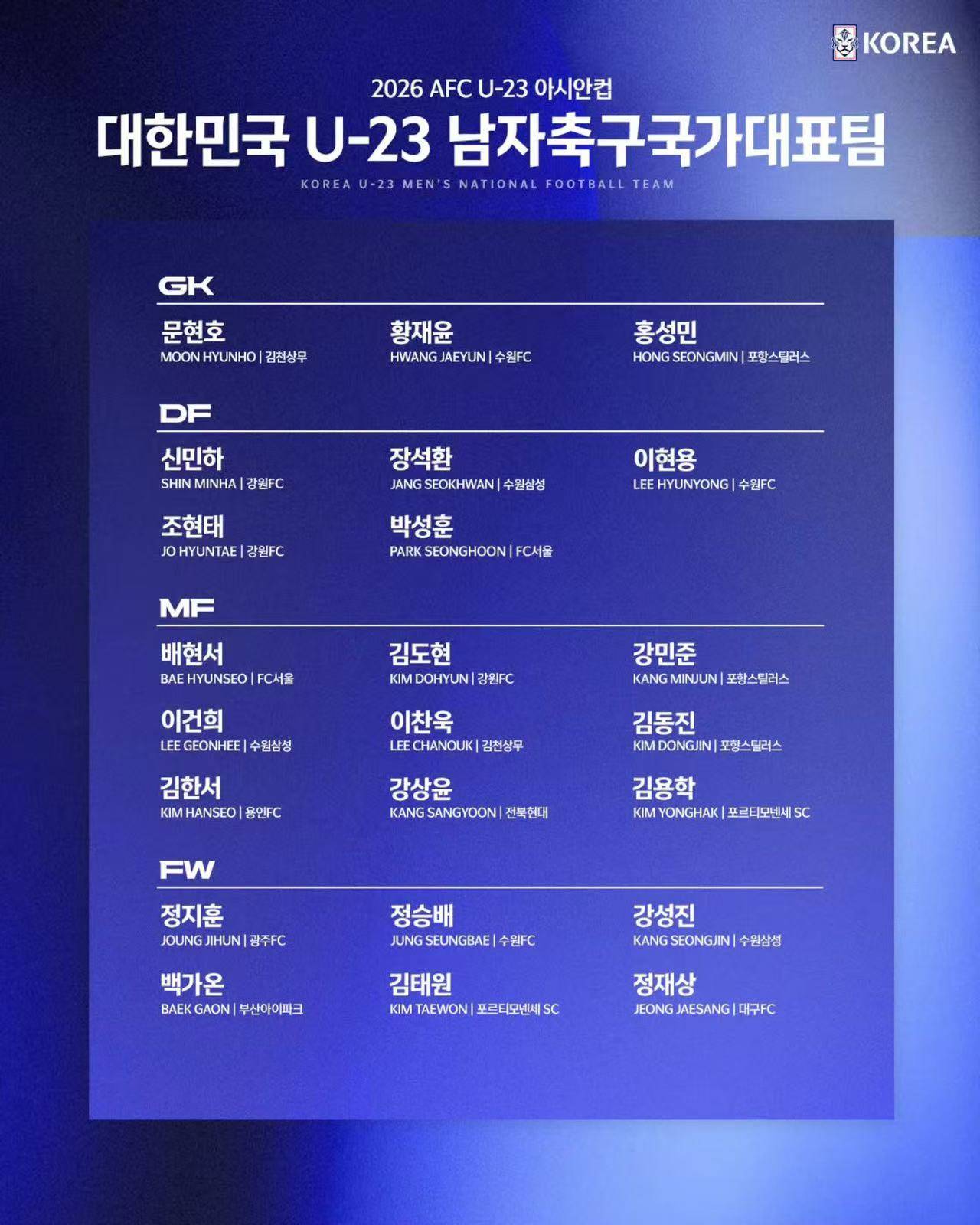 12月21日,韩国U23国家队主帅李敏成正式对外公布了参加明年1月沙特U23亚洲杯的23人大名单,这也意味着韩国U23代表队即将进入“利雅得时间”!