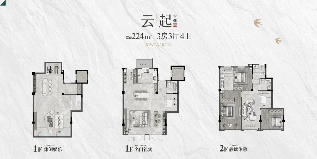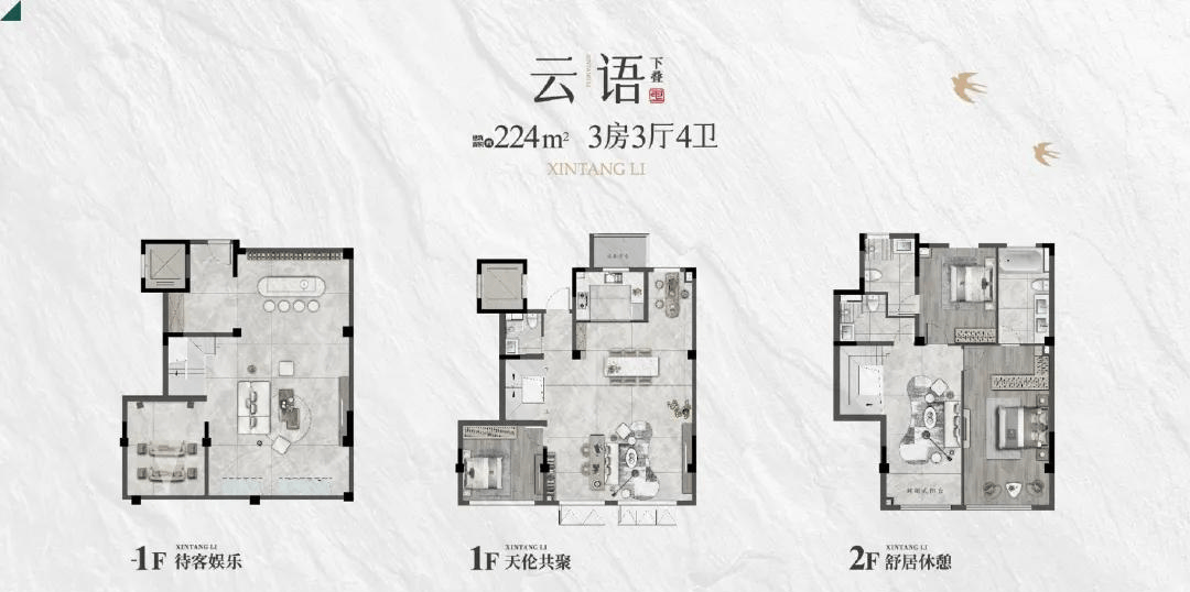 ·建筑面积约为224.6㎡3房3厅4卫的户型,下叠分为三层,地下一层,地上二层、(地下一层属于附带)。