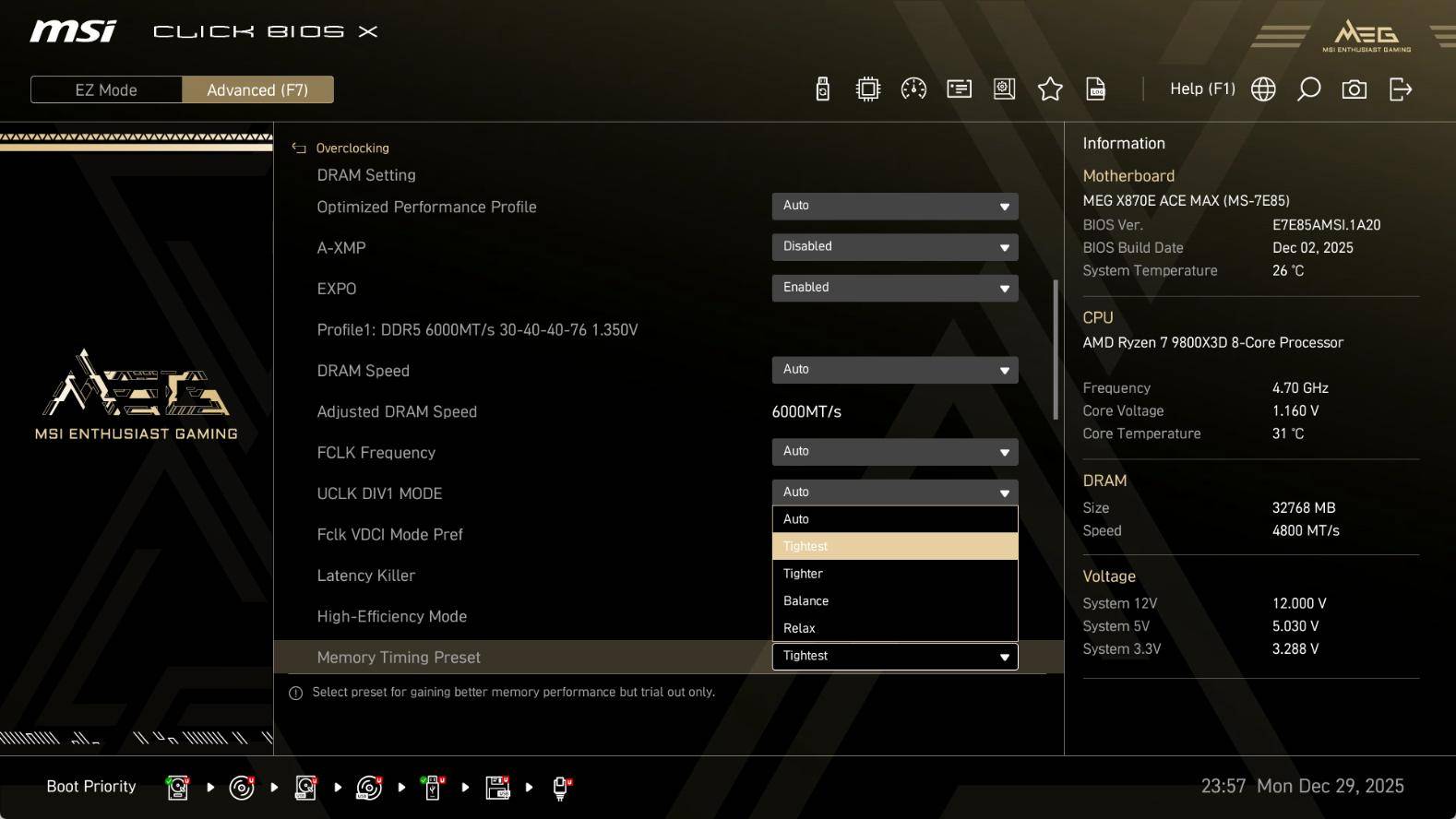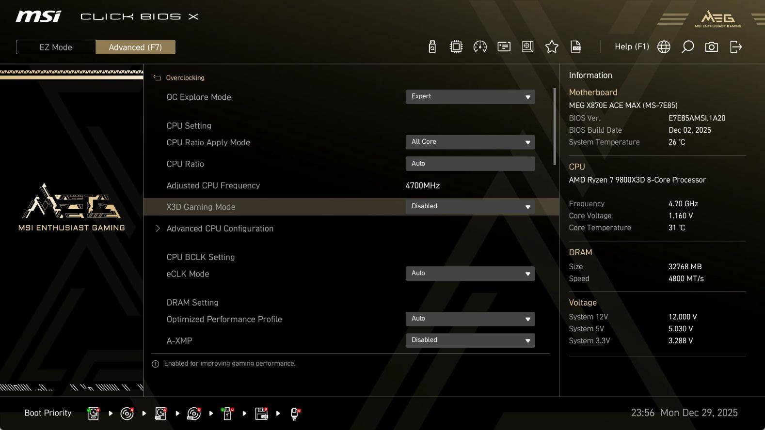 微星MEG X870E ACE MAX战神主板自然是采用最新的CLCIK BIOS X,相信很多小伙伴都已经能轻松上手。比如简易模式下,可对PBO、EXPO、Memory Try It!、X3D Gaming Mode等功能进行开启,同时还能一键对CPU、NPU进行超频设置,易用性极佳。