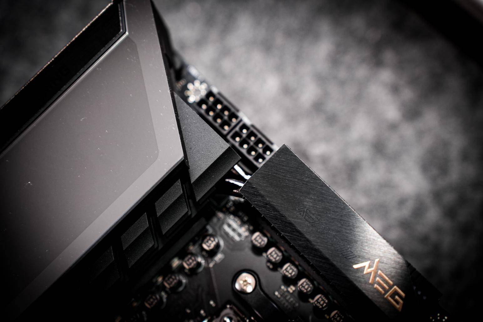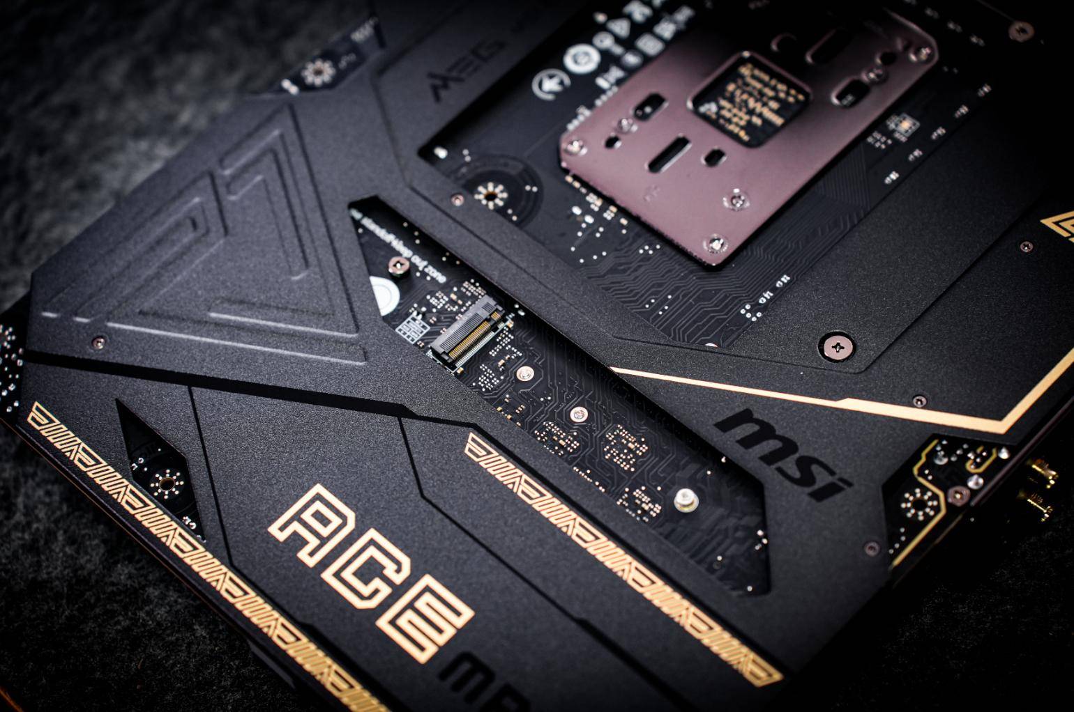 主板的背面也覆盖了一块金属背板,上方也有ACE和MEG的标识,该背板一方面是增强主板的抗扭强度,防止主板形变;另一方面也能增加散热,保证主板供电部分在高负载环境下的稳定输出。