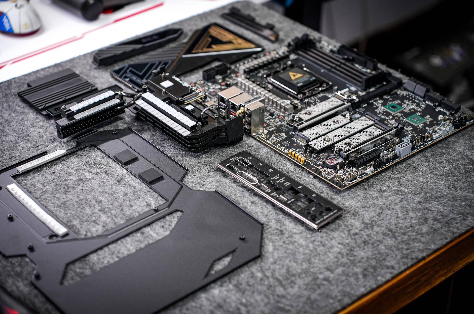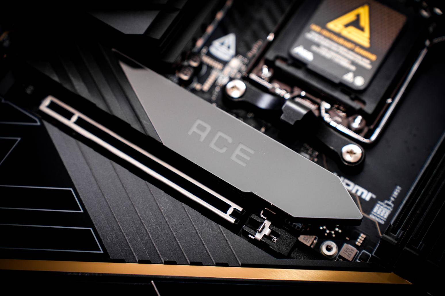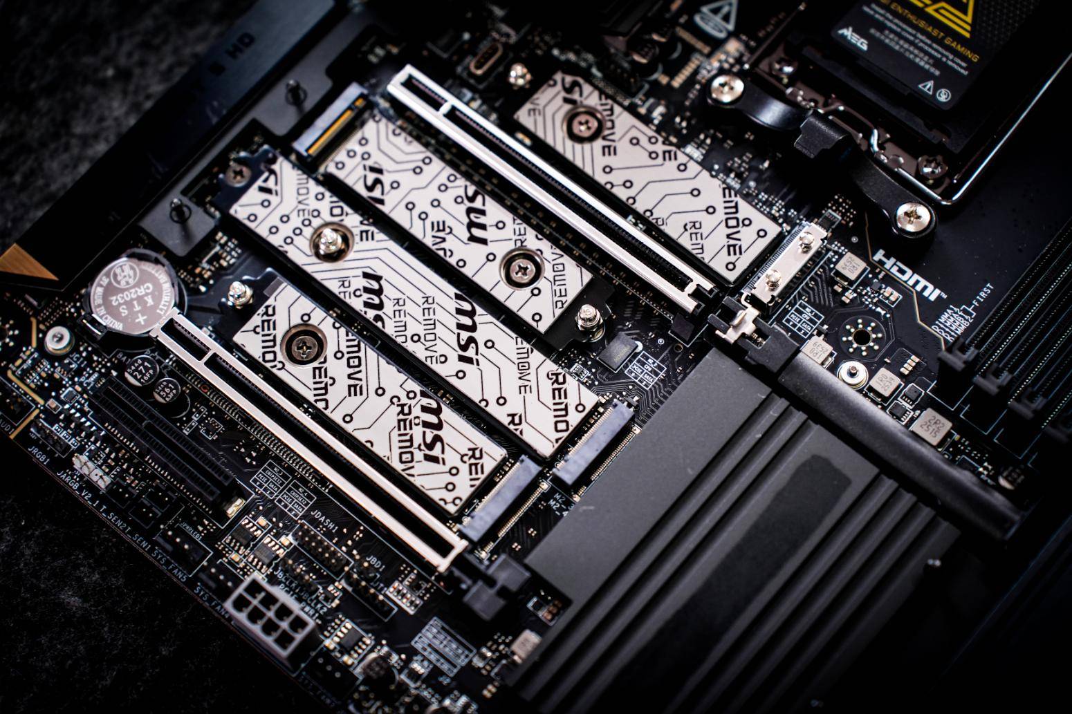 同时,所有M.2插槽均配备了免工具安装的冰霜铠甲散热片,通过磁吸+卡扣的设计可让用户在拆装M.2 SSD时单手就可完成所有操作。