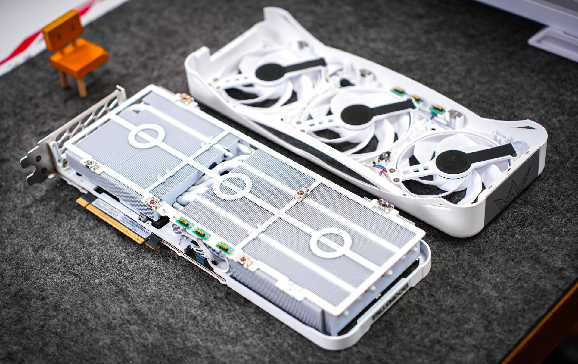 除了性能上表现突出,该显卡在设计上也非常有创意,首创磁吸式上盖,清灰维护都无需螺丝刀等工具;外观方面白色雾面机身搭配三面环抱式ARGB灯效,镜面背板可映射光影,还附赠可替换背板满足个性化需求。散热方面则是采用磁星MAX模组,7根镀镍热管+优化霜环风扇,实测散热表现也是出类拔萃。