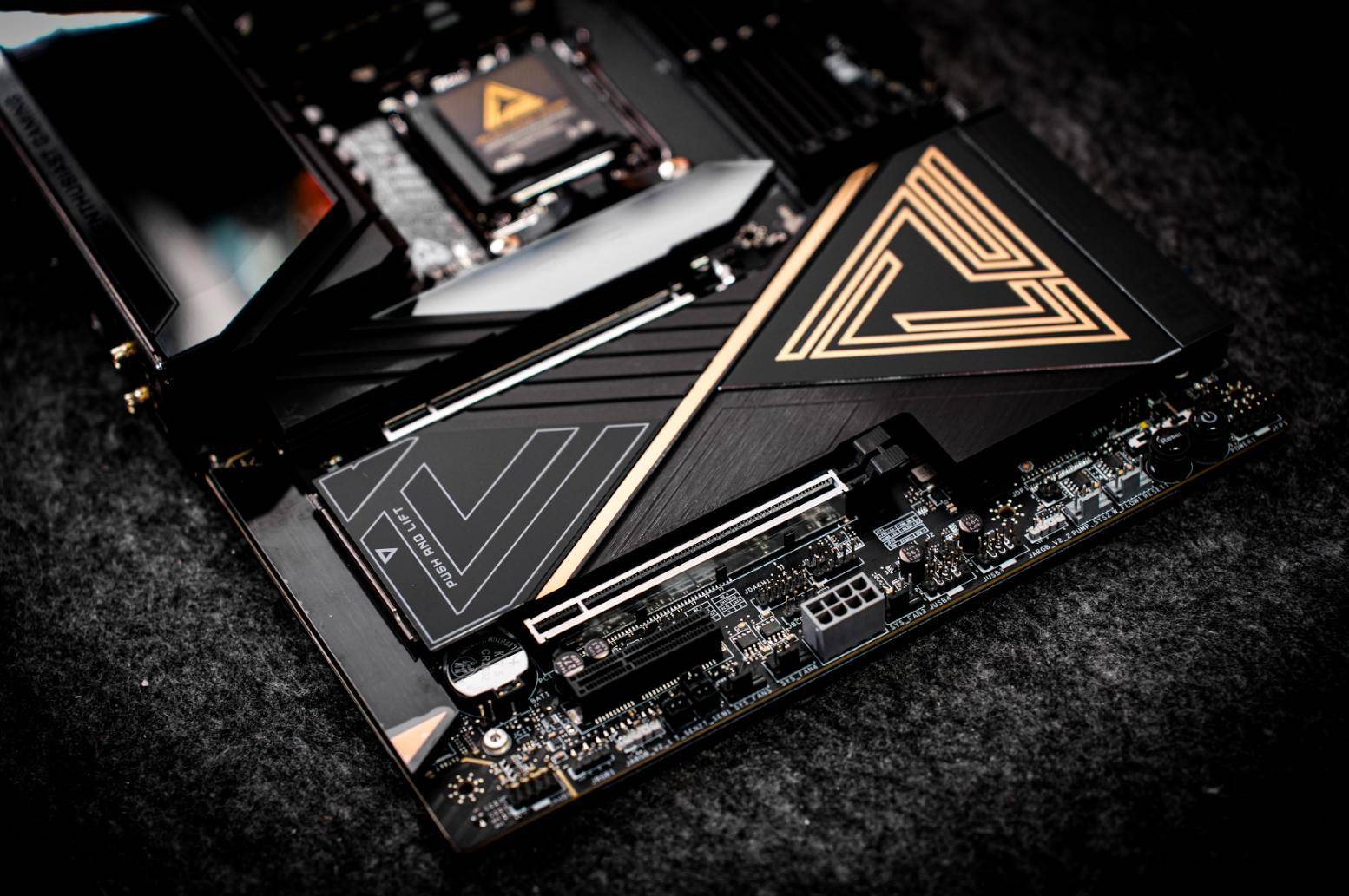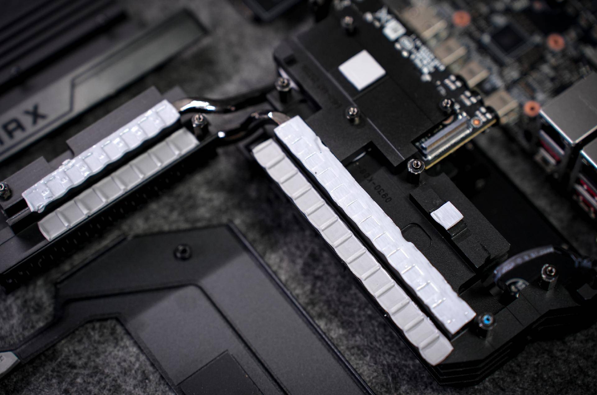 细节设计上,设计师们也是充分兼顾了实用性与便捷性。VRM供电区域通过多重散热设计构建立体散热网络,比如波浪式鳍片散热装甲,内部搭载了直触式交叉热管,再配合高品质9W/mK MOSFET导热垫。不仅让主板从视觉观感上更极具冲击力,同时让散热效率达到了最大化。