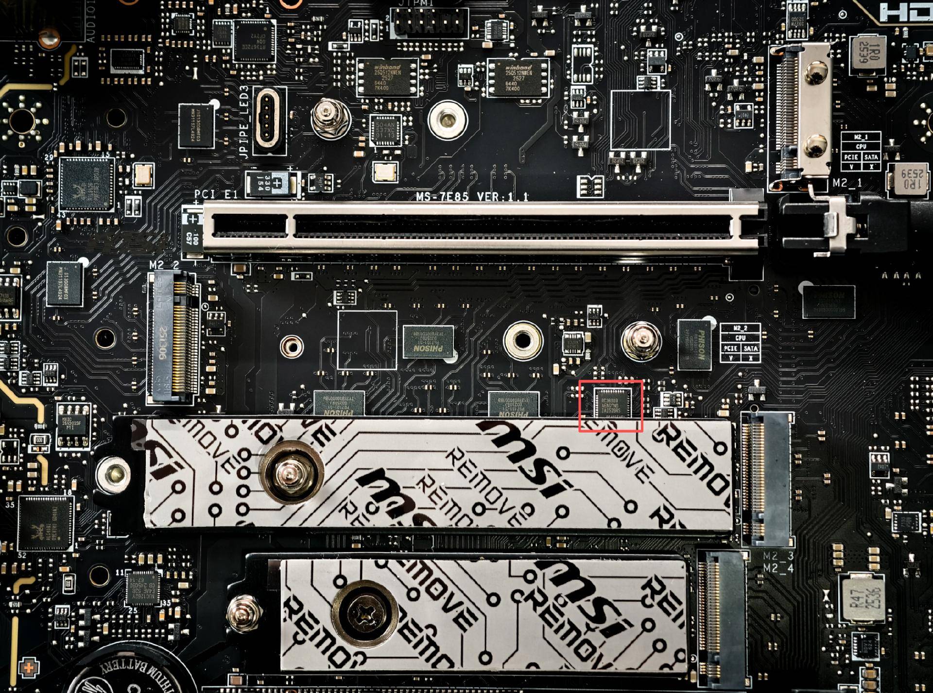 存储方面上,主板共提供5个M.2插槽(正面4个,背面1个),其中2个支持PCIe 5.0协议,其余3个为PCIe 4.0规格,全面覆盖了不同速率需求的NVMe SSD。正面的M.2插槽均配备双面M.2 Shield Frozr冰霜铠甲,通过高效散热设计能有效解决SSD在高速读写时的发热问题,避免因过热导致的降速,保障数据传输的稳定性和安全性。