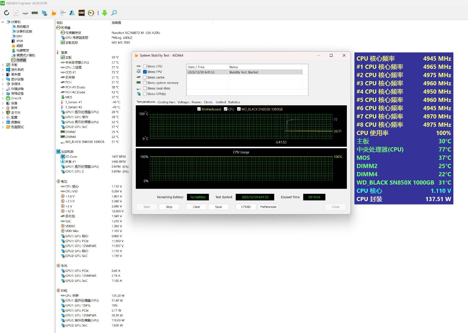 拷机测试,在Game Boost开启的状态,9800X3D处理器的功耗为138W左右,核心频率保持在全核5.0GHz。在室温16℃的情况下,表现十分出色,核心最高温度仅为77℃。